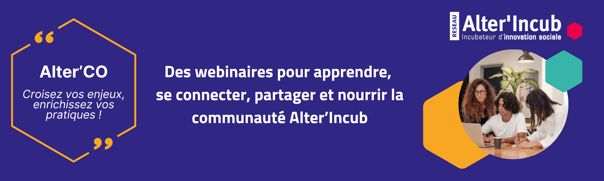 Avec Alter’CO, le Réseau Alter’Incub ouvre un nouvel espace de formation et d’échanges, pensé pour soutenir les incubés tout au long de leur parcours. Ces webinaires sont l’occasion de se former autrement, de croiser les regards et de faire vivre la force du collectif.